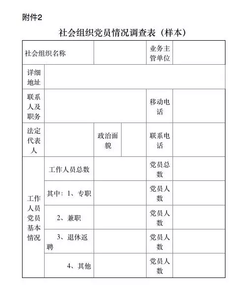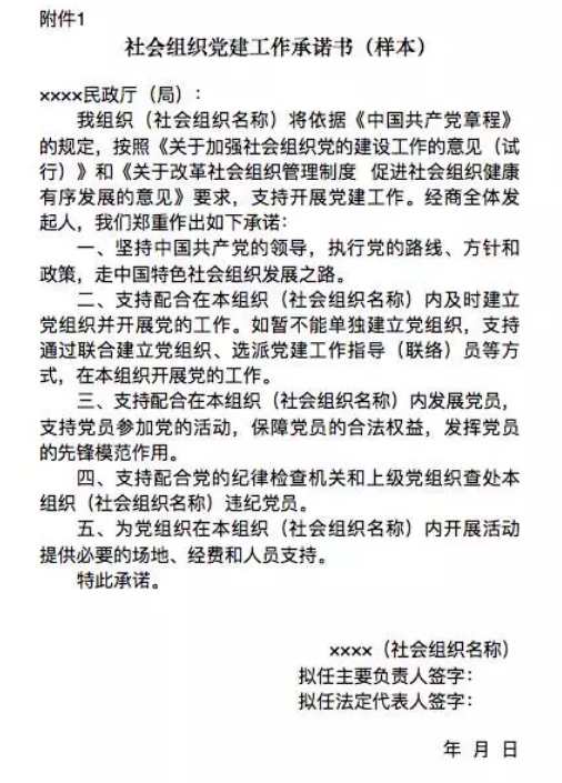 一、申请新成立社会组织,应当同时向登记管理机关提交《社会组织党建工作承诺书》(附件1)。登记管理机关批准社会组织登记后、社会组织申领证书前,应当由社会组织向登记管理机关提交《社会组织党员情况调查表》(附件2)。《社会组织党建工作承诺书》《社会组织党员情况调查表》须由该组织拟任主要负责人和拟任法定代表人共同签字。
