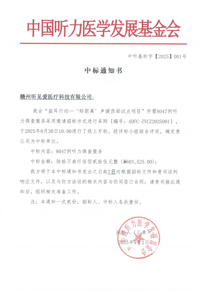 益耳行动-“聆距离”声援西部试点项目听力筛查服务中标通知