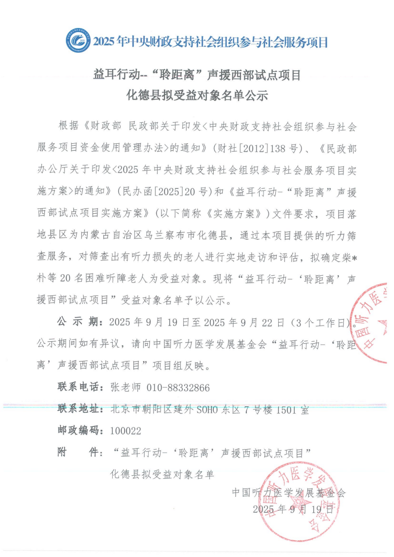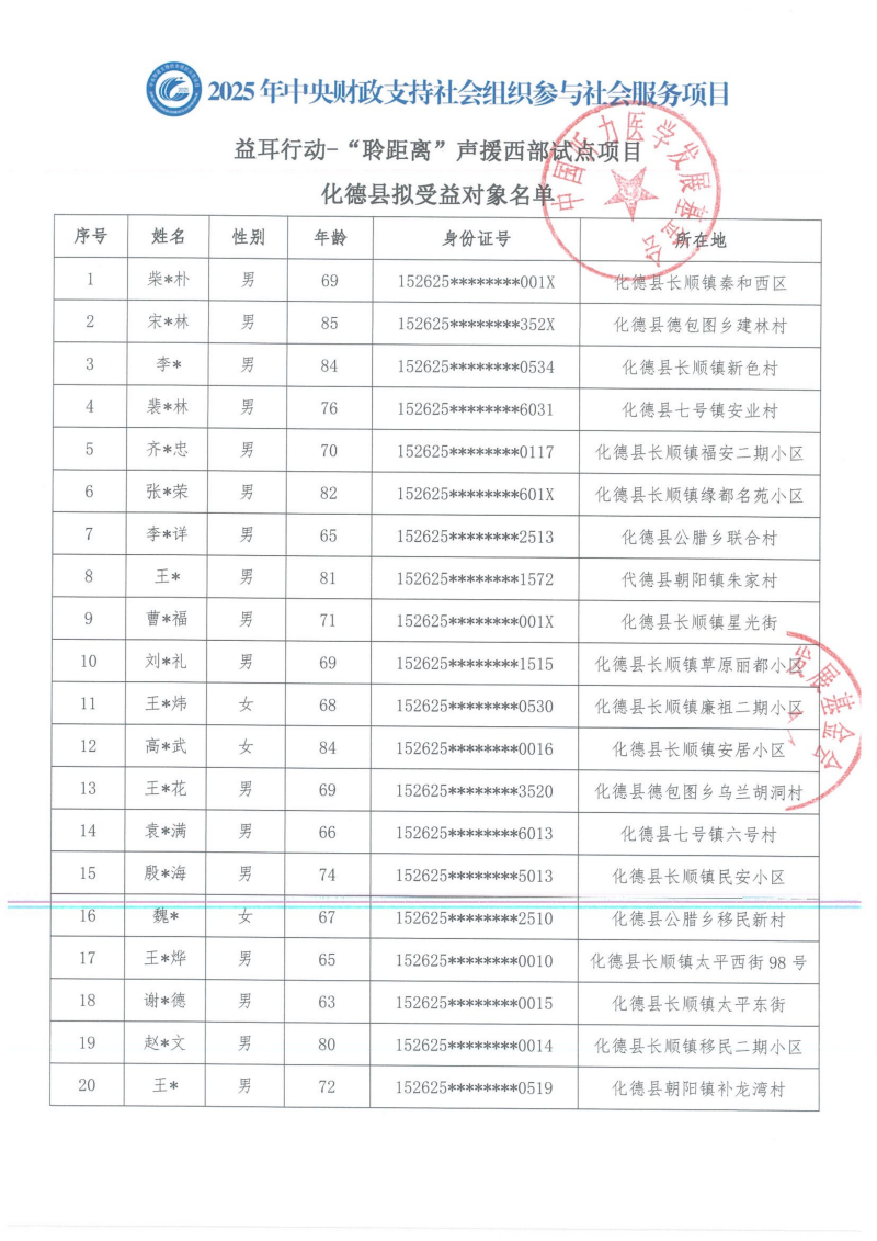 益耳行动-”聆距离“声援西部试点项目化德县拟受益对象名单公示