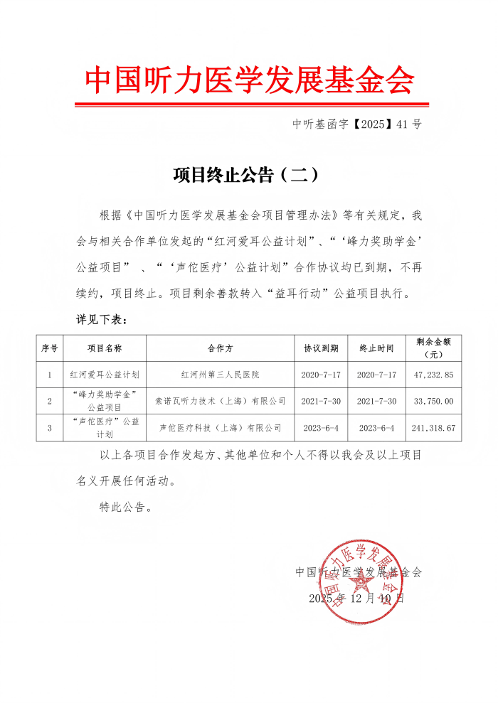 中国听力医学发展基金会 项目终止公告(二)