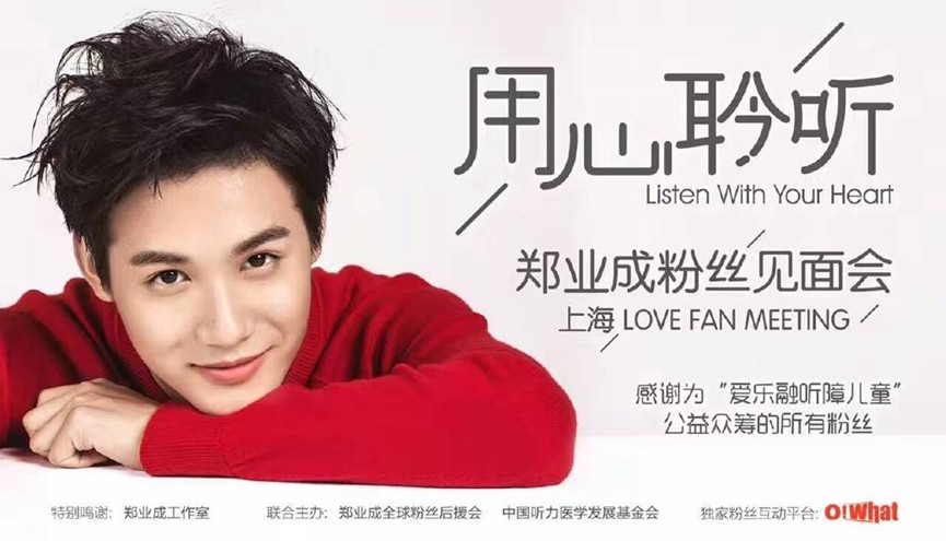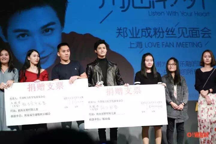 2016年10月16日下午,“美人师兄”郑业成的公益粉丝见面会上,郑业成携手爱心粉丝向中国听力医学发展基金会“爱乐融聆听计划公益基金”捐赠善款121000元,帮助听障儿童重返有声世界。嘘,别说话,让我们一起用心聆听郑业成。
