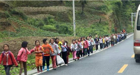 这只是四大寨民族小学走读学生的一小队。全校780名学生中有将近200人的上学路在2公里以上。家离学校最远的走读生,要数新寨村摆架寨的李德俊、姚良峰等5人,全程8公里左右,来回16公里,每天要在路上花费4个小时的时间。
