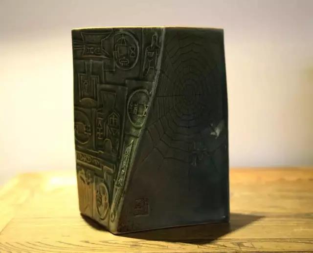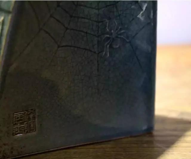 畅谈中,董宁先生起身从身后的多宝阁中取出一件器物让我们观赏。初一见我还是楞了一下,貌似一个大海碗却又不像,于是便问其谓何名?“此器为盏,尚未取名”董先生似有所思的答道。“好大的盏呀!”我不禁一笑。再仔细一看,不禁慨叹董先生的文化创意,青釉大盏形成的龟裂给人一种古朴雅致之美,好似美玉琢磨而成,做工十分细腻考究。而真正吸引我的是盏中那纵横的丝网与盏口的一只蜘蛛。蛛网很浅很浅,浅到不经意则难以发现,倒是那只蜘蛛,虽在静静守候,却能让人一眼便认出来。我似乎明了董先生的用意,小心地擎在手中细看,果然在盏外侧还有一张浅浅的蛛网在萦绕着,呼应的是那么自然、贴切。