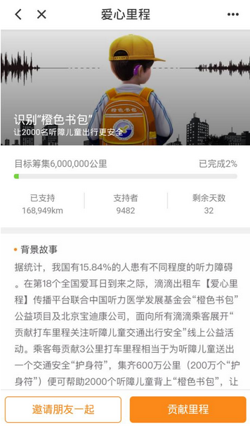 3月3日是第十八个全国“爱耳日”,也是“国际爱耳日”。据统计,我国有15.84%的人患有不同程度的听力障碍,新生儿听力障碍发生率在千分之一至千分之三,每年新生听力残疾儿童2~3万人。在“爱耳日”这个特殊的日子里,我会联合滴滴出租车【爱心里程】及北京宝迪康公司,面向所有滴滴乘客展开“贡献打车里程关注听障儿童交通出行安全”公益活动。乘客每贡献3公里打车里程,相当于为听障儿童送出一个交通安全“护身符”,集齐600万公里(200万个“护身符”)便可帮助2000个听障儿童背上“橙色书包”,让他们安全地在马路上行走。