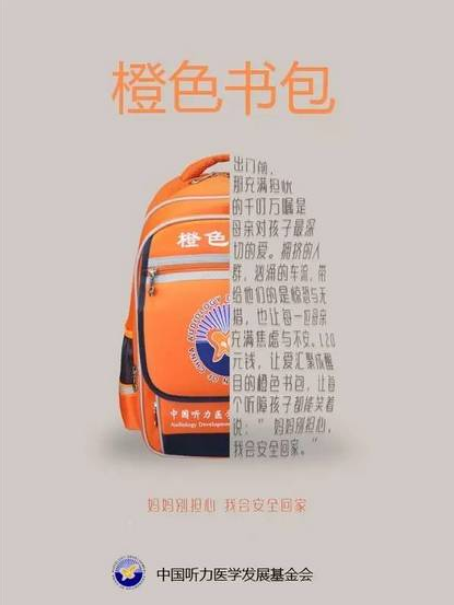 “橙色书包”公益计划,是由我会于2016年爱耳日发起的公益项目。旨在为听障儿童提供带有特殊标识的橙色书包,引发大众对听障儿童交通安全的关注,保护他们出行安全。