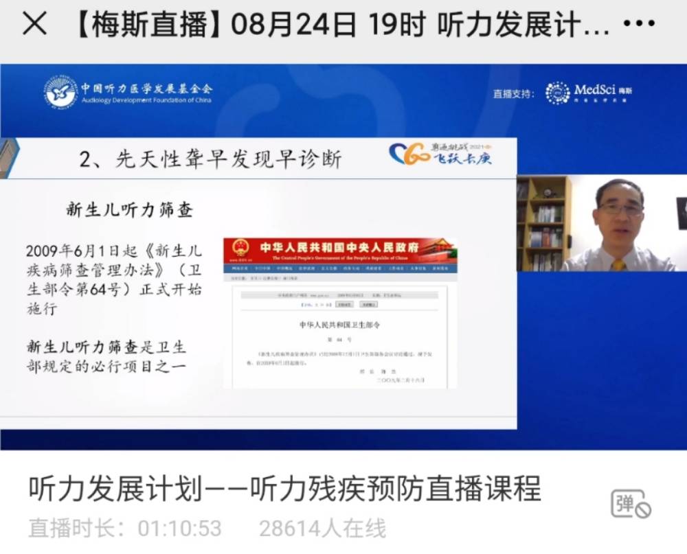 2021年8月25日是我国第五个全国残疾预防日,我会紧密围绕预防日主题“加强残疾预防,促进全民健康”,为让更多的耳鼻喉科医生能对听力残疾预防的概念及内涵有更深入的了解,“听力发展计划”系列云课堂于2021年8月24日晚19:00开启了直播课程。课程邀请到我会耳聋基因诊断与防控专家委员会主任委员、解放军总医院(301医院)耳鼻咽喉头颈外科主任医师、博士生导师袁永一教授和厦门长庚医院常务副院长、人工耳蜗中心主任卓明英教授直播授课。两位专家分别从《遗传性聋的发病、预防、干预》和《先天性聋的早期发现、干预及康复》两个议题切入,帮助从事听力医学的医护人员、关注听力残疾的社会公众、以及新婚夫妇、孕产妇、婴幼儿家长、听障群体等重点人群认识、了解相关的听力残疾预防知识,学习尽早发现、尽早干预的方法。直播课程由我会执行副秘书长甄丽霞主持,2万8千多听力医护人员、康复人员及网友参与直播课程。