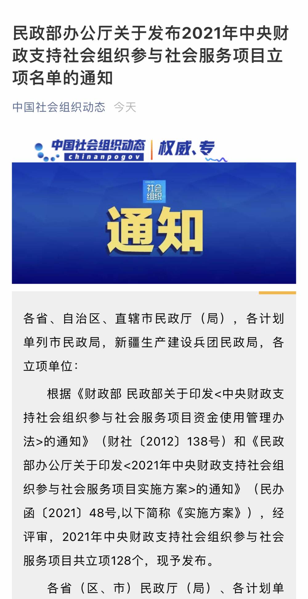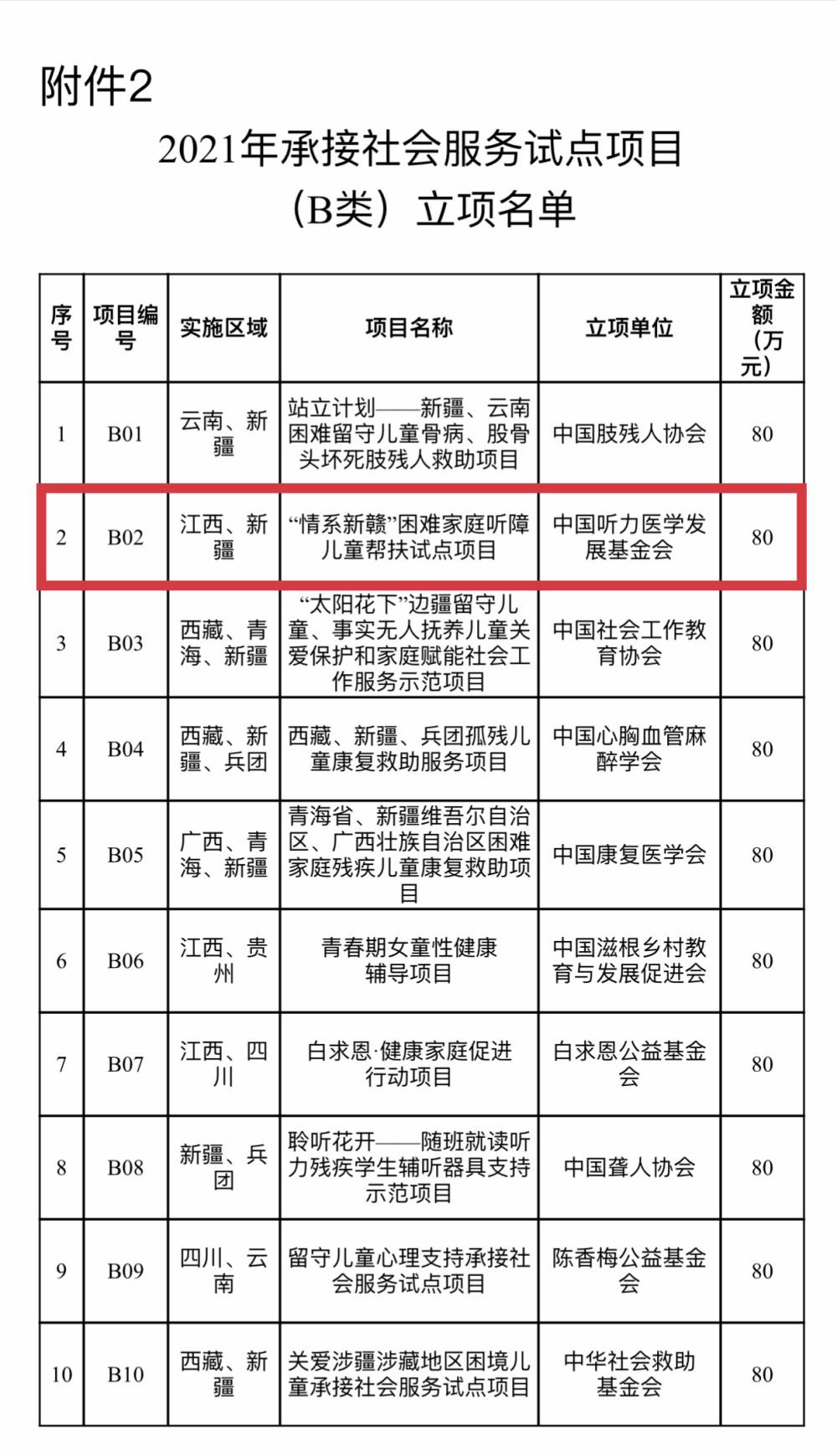 2021年9月1日,民政部办公厅发布《2021年中央财政支持社会组织参与社会服务项目立项名单的通知》,经评审,2021年共获批立项128个项目,我会申报的2021年承接社会服务试点项目(B类)《“情系新赣”困难家庭听障儿童帮扶试点项目》获得批准立项。