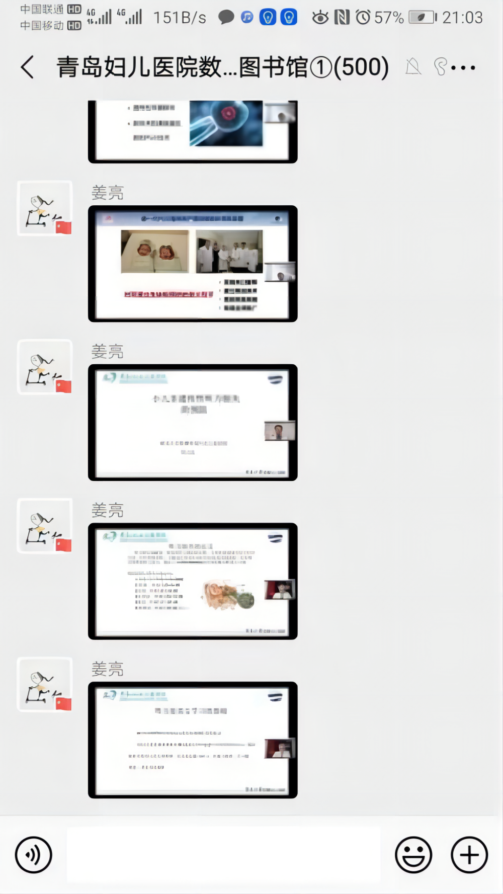 为加强预防出生听力缺陷,时值9月12日中国预防出生缺陷日,“听力发展计划”系列云课堂于9月12日19:00-21:00,我会联合百度健康、百度公益开展《中国预防出生缺陷日主题直播课程》,本次课程特别邀请到中国人民解放军总医院耳鼻咽喉头颈外科医学部学术委员会主任戴朴教授、青岛大学附属妇女儿童医院耳鼻喉科主任刘玉欣教授主讲。他们分别从《遗传性聋的机理、预防、人工生殖干预》和《小儿非遗传性听力损失的预防》两个主题进行分享,为医生、康复教师、社会公众等讲授耳聋预防、诊断、治疗等方面的专业知识。本次直播课程由我会专家指导委员会秘书长、中国人民解放军总医院耳鼻咽喉头颈外科医学部研究员郗昕教授主持,在线7300多听力医护人员、康复人员及网友参与直播课程,课程重点在2018年、2019年、2020年、2021年青岛市妇女儿童医院出生缺陷防治人才培训学员群、2021年青岛市出生缺陷综合防治培训群、青岛出生缺陷技能培训班群、青岛大学附属妇女儿童医院的耳鼻喉科工作群以及青岛妇儿医院数字化图书馆等工作群中做了课程推介,微信群中的医护人员认真听课,积极分享学习内容。
