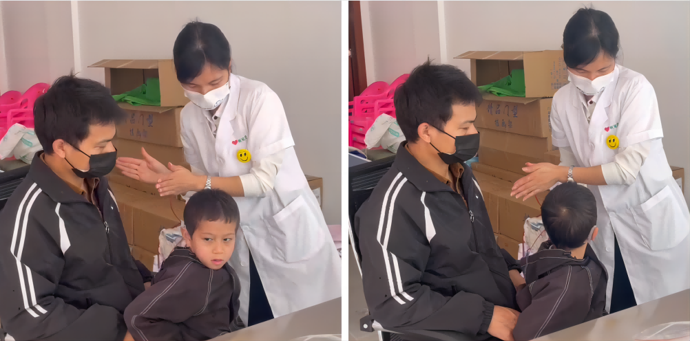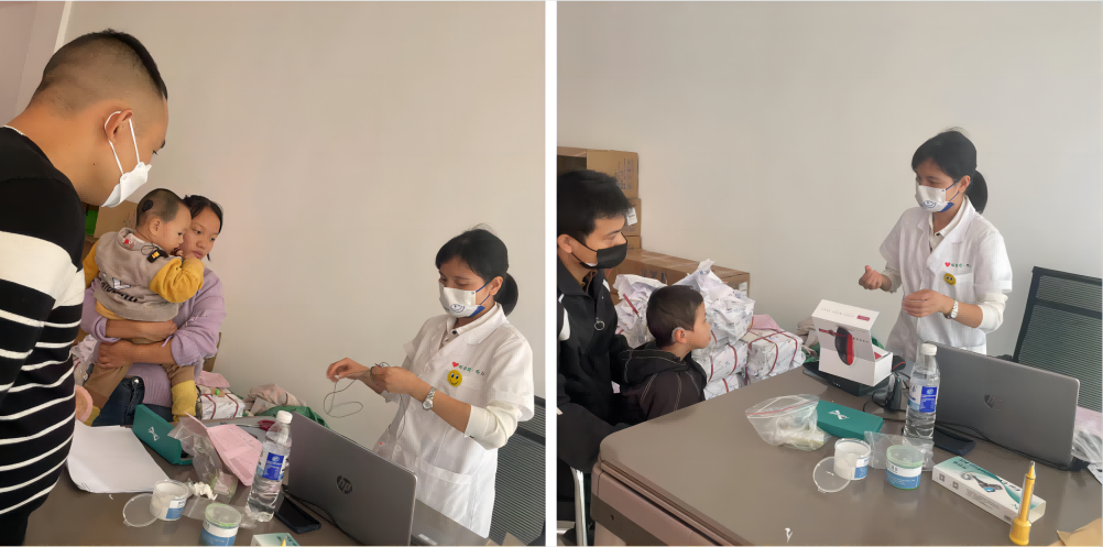 在活动过程中我们发现一位爸爸需要特别大声和孩子说话,沟通起来非常吃力,我们上前了解了情况,孩子名叫晨晨(化名),今年7岁,从出生到现在一直听得不好,也不太爱说话,家长需要很大声喊他才能听到,这期间也从来没有进行过康复训练,目前虽然送进了正常的幼儿园,但正常交流是无法听见的。我们马上对晨晨进行了全面的听力评估,决定给他佩戴助听器进行干预。在医生细致而专业的检查下,根据孩子听力损失程度适配了助听器,随后医生在晨晨的身后拍手,他可以迅速地转头寻找声音,晨晨的爸爸也露出了开心的笑容。