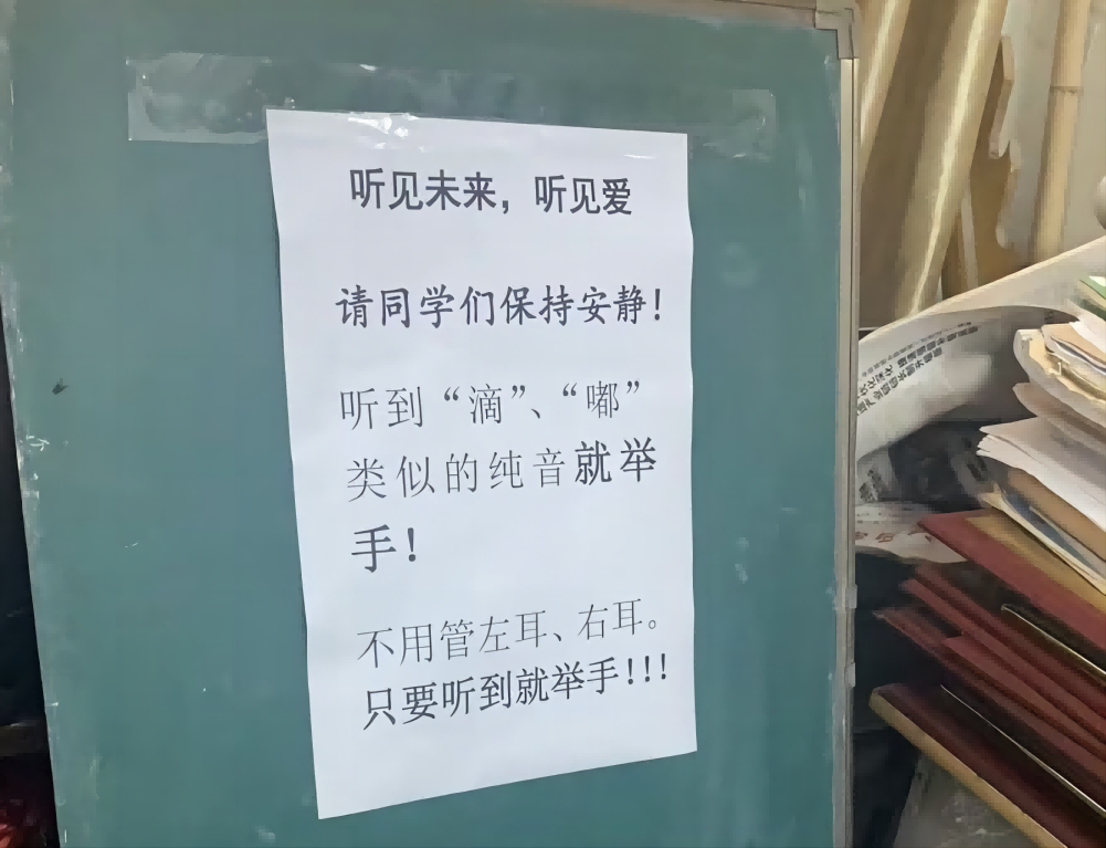 在听力筛查义诊现场,听力师首先给同学们讲解了爱耳护耳健康知识,为同学们展开外耳道检查。同时,小黑板也写下提示:请同学们保持安静!听见“滴”、“嘟”声就举手!不用管左耳、右耳,只要听到就举手!!!同学们第一次接受听力检查,既好奇又有点小紧张。在听力师及志愿者老师的耐心指导下,听力筛查活动有序进行。