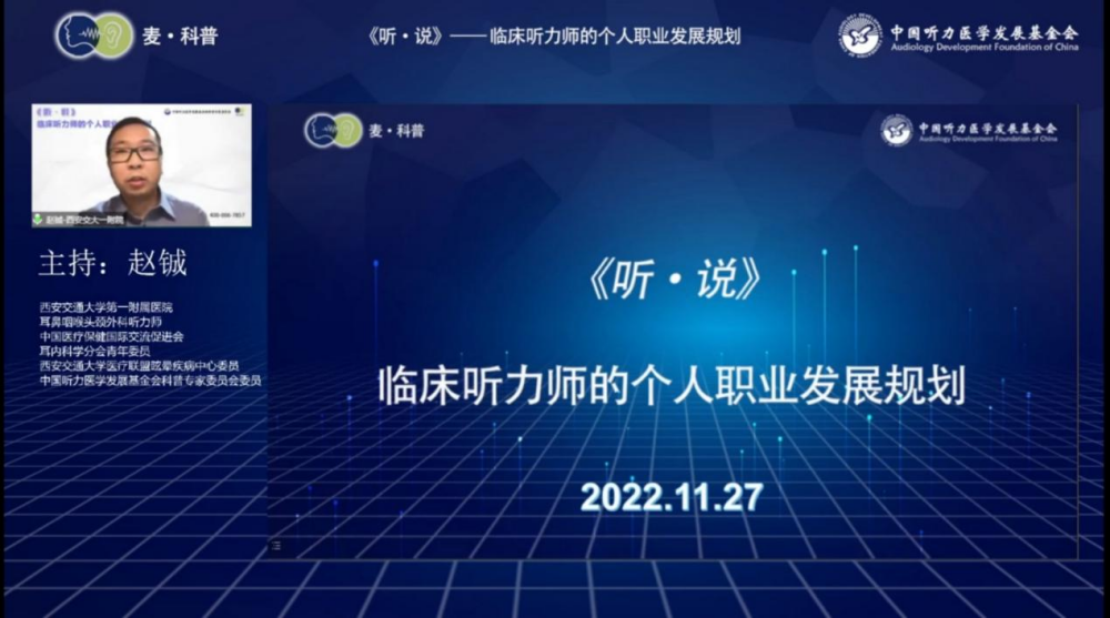 2022-11-28来源:听基会11月27日下午,我会《听·说—临床听力师的个人职业发展规划》主题沙龙通过线上方式成功举办。本期沙龙旨在帮助听力学、听力与言语康复学及相关专业的从业者、在读学生做好个人职业发展规划,提升专业能力。2300余位听力及言语康复及相关专业的从业人员参与交流与互动。
