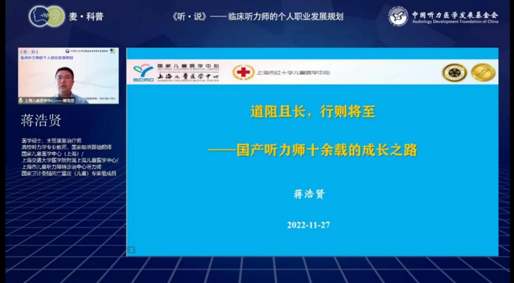 国家儿童医学中心(上海)、上海交通大学医学院附属上海儿童医学中心、上海市儿童听力障碍诊治中心的听力师蒋浩贤老师,通过回顾自己十余年的工作经历和成长之路,告诉大家在个人职业生涯规划中首先要明确方向和确定目标,然后为了目标脚踏实地的去努力达成目标一定会有成长和收获的。