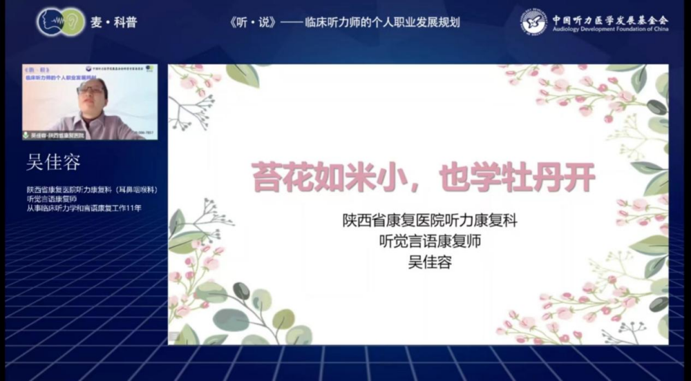 陕西省康复医院听力康复科(耳鼻咽喉科)的听觉言语康复师吴佳容老师,通过对国内言语语言治疗现状的架构,让我们知道一个SLP(言语语言治疗师Speech Language Pathologist)的工作内容和目的,听力学的学生也是可以做SLP的,这要求我们不但要学习专业课知识,还要掌握教育学,心理学和特殊教育学等内容。临床听力学工作不仅只是让听障人群听到声音,更重要的是让他们听清楚。只有听还不够,还要能说会道,正如我们沙龙的主题《听·说》,听和说是密不可分的,听觉言语康复师的工作也是非常重要的。目前我国是非常缺少SLP,希望越来越多的听力与言语康复学的学子,选择这个非常有成就感的职业。