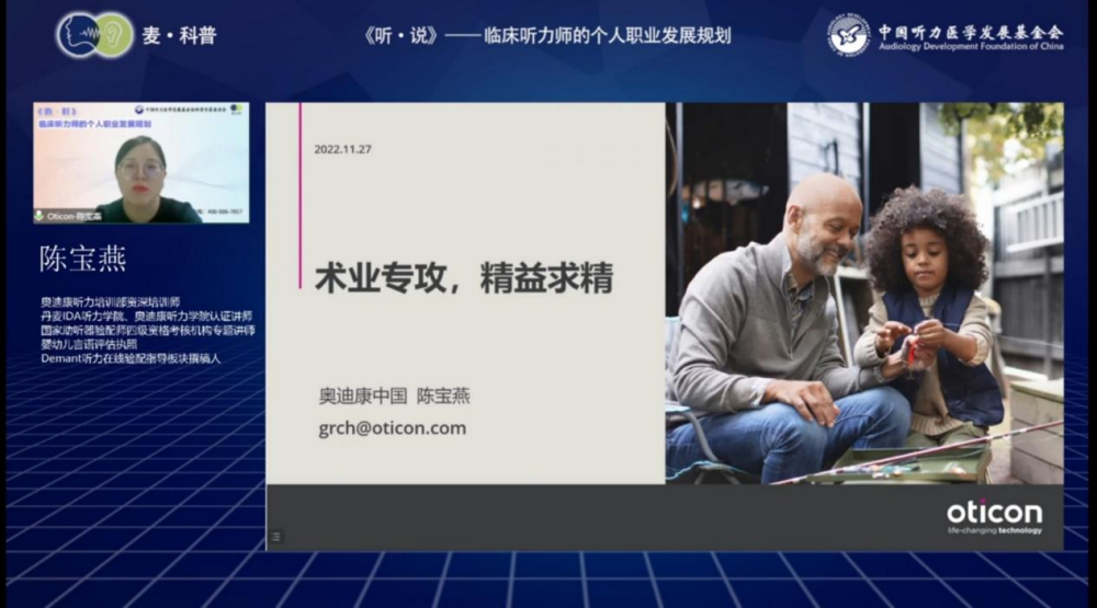 奥迪康听力培训部的资深培训师陈宝燕老师从自身在外企就职经验分享了企业就业岗位多,可以结合自己的兴趣点,尽可能多的体验,尽早做好个人职业规划。根据国家助听器验配师职业目录(2020)要求和目前助听器行业的情况、听力障碍人群的数据来看,听力和言语康复领域的就业需求非常高。学习好专业知识、技能,提升自我的核心硬实力。在校学习期间,可以提早考取证书,抓技能、长经验、拓视野。