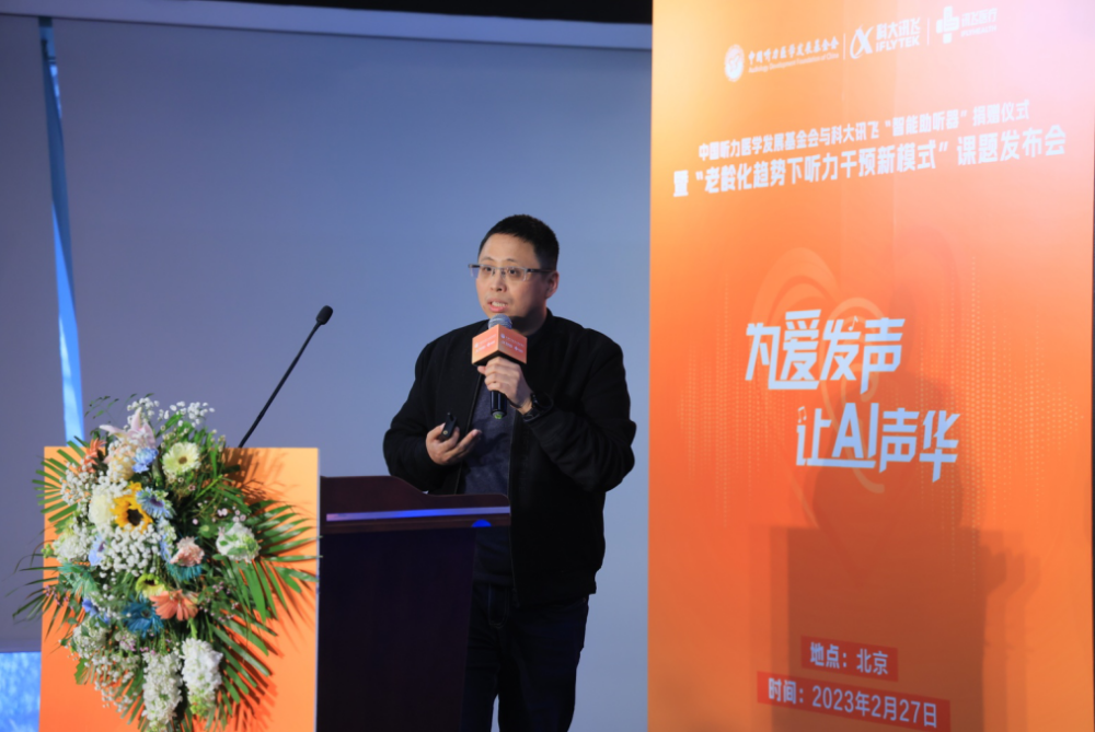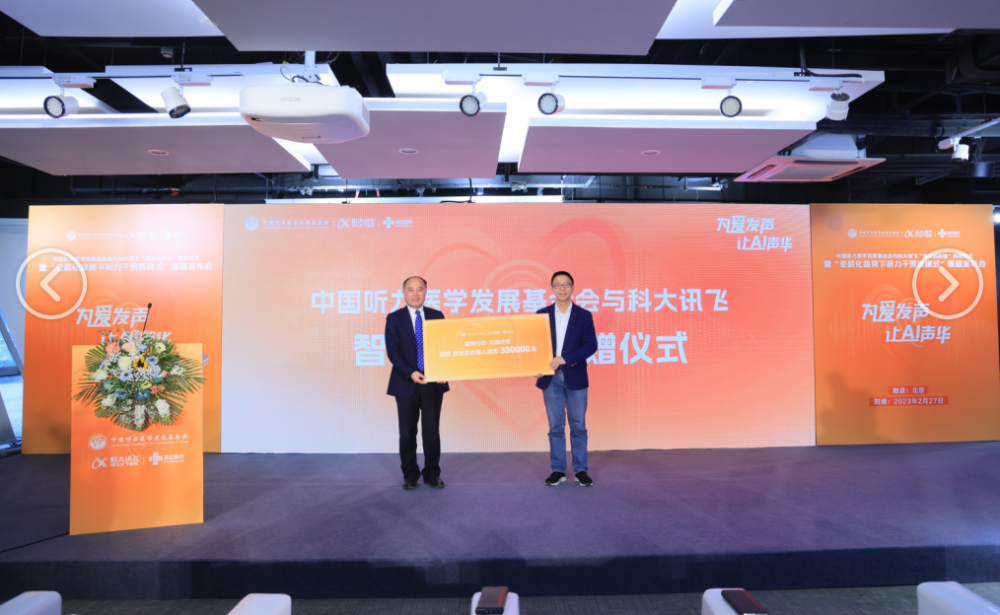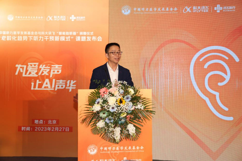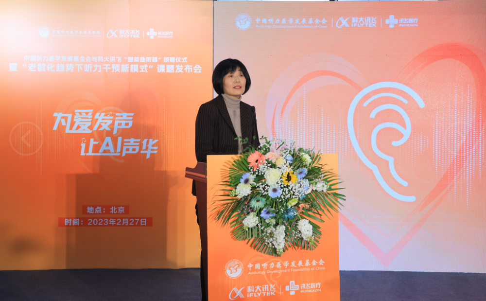 2月27日下午,由我会与科大讯飞共同发起的“老龄化趋势下听力干预新模式”科研课题发布会在科大讯飞北京总部成功举行。我会理事长龚树生,常务副理事长兼秘书长、党支部书记公泽忠,中国听力语言康复研究中心党委书记、主任纳新,国家耳鼻咽喉疾病临床医学研究中心研究员郗昕,科大讯飞联合创始人、高级副总裁江涛,讯飞医疗执行总裁鹿晓亮,智能硬件业务线总经理崔荣涛参加了发布仪式。活动现场,科大讯飞向我会“益耳行动”公益项目捐赠讯飞“智能助听器”等物资,旨在通过AI技术帮助更多听障人士“听见”世界。会议由我会执行副秘书长甄丽霞主持。