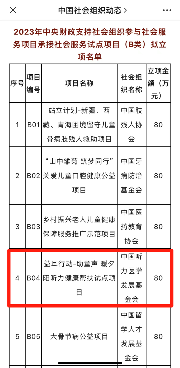 我会“益耳行动——助童声 暖夕阳听力健康帮扶试点项目”获中央财政支持社会组织服务项目立项支持