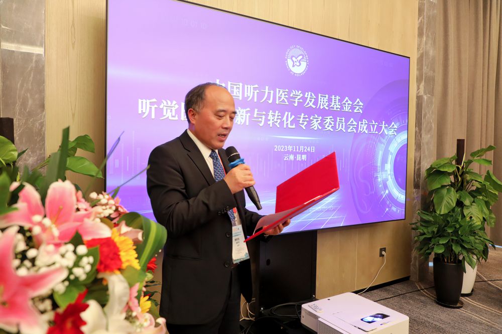 龚树生理事长宣读成立“听觉医学创新与转化专家委员会”的决定,舒易来教授当选为“听觉医学创新与转化专家委员会”主任委员并发表感言。