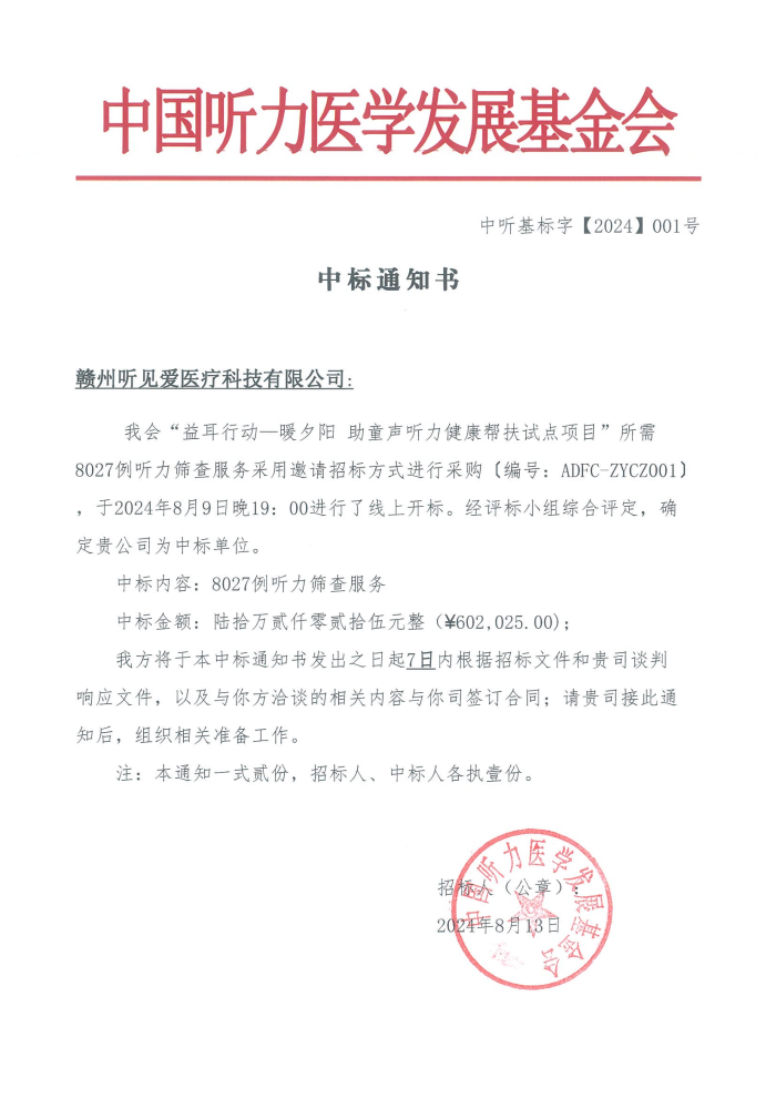 中国听力医学发展基金会”益耳行动-暖夕阳 助童声 听力健康帮扶试点项目“听力筛查服务中标通知书