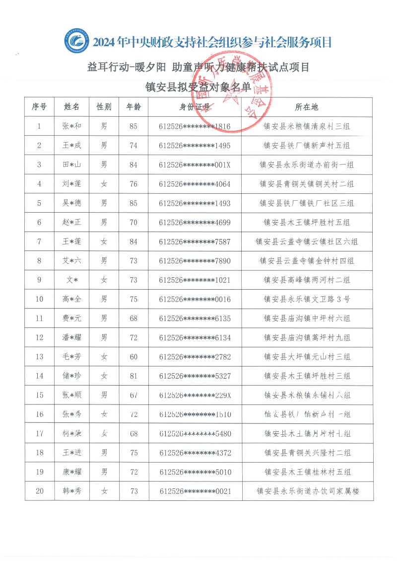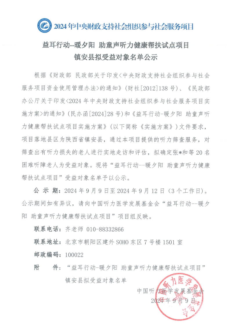 益耳行动-暖夕阳 助童声听力健康帮扶试点项目镇安县拟受益对象名单公示