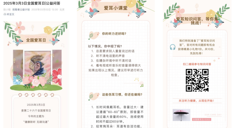 拾聪者公益计划专项基金通过线上爱耳知识问答的形式,以趣味互动为切入点,向大众普及听力健康知识,让更多公众在轻松的氛围中了解听力保护的重要性。